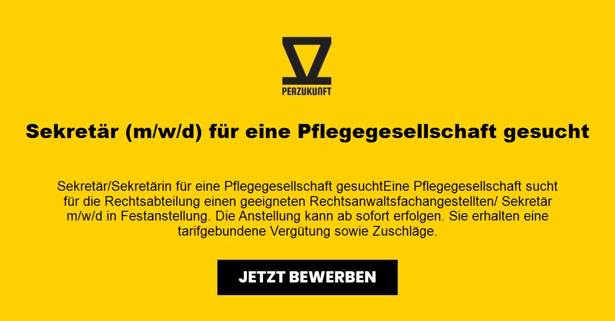 Sekretär/Sekretärin für eine Pflegegesellschaft gesucht Eine Pflegegesellschaft sucht für die Rechtsabteilung einen geeigneten Rechtsanwaltsfachangestellten/ Sekretär m/w/d in Festanstellung. Die Anstellung kann ab sofort erfolgen. Sie erhalten eine tarifgebundene Vergütung sowie Zuschläge.