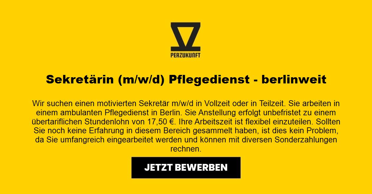 Wir suchen einen motivierten Sekretär m/w/d in Vollzeit oder in Teilzeit. Sie arbeiten in einem ambulanten Pflegedienst in Berlin. Sie Anstellung erfolgt unbefristet zu einem übertariflichen Stundenlohn von 19,98 €. Ihre Arbeitszeit ist flexibel einzuteilen. Sollten Sie noch keine Erfahrung in diesem Bereich gesammelt haben, ist dies kein Problem, da Sie umfangreich eingearbeitet werden und können mit diversen Sonderzahlungen rechnen.