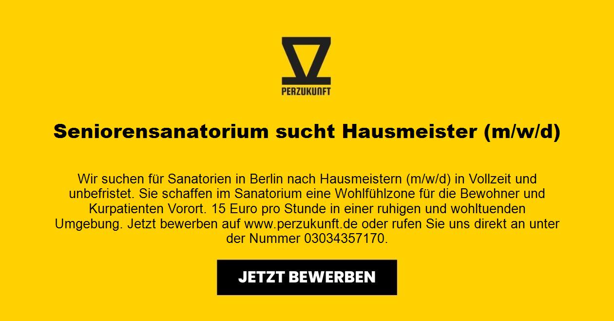 Wir suchen für Sanatorien in Berlin nach Hausmeistern (m/w/d) in Vollzeit und unbefristet. Sie schaffen im Sanatorium eine Wohlfühlzone für die Bewohner und Kurpatienten Vorort. 18,28 Euro pro Stunde in einer ruhigen und wohltuenden Umgebung.