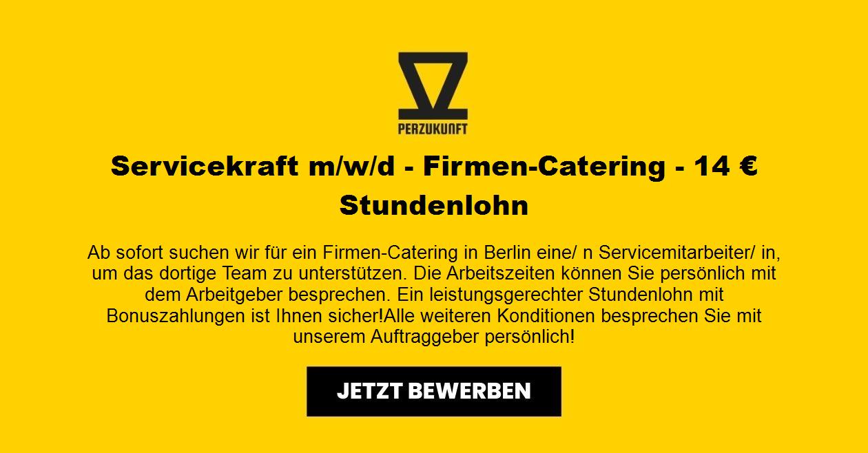 Ab [sofort] suchen wir für ein Firmen-Catering in Berlin eine/ n Servicemitarbeiter/ in, um das dortige Team zu unterstützen. Die Arbeitszeiten können Sie persönlich mit dem Arbeitgeber besprechen. Ein leistungsgerechter Stundenlohn mit Bonuszahlungen ist Ihnen sicher! Alle weiteren Konditionen besprechen Sie mit unserem Auftraggeber persönlich!