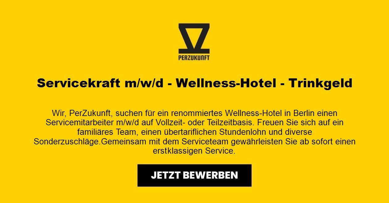 Wir, PerZukunft, suchen für ein renommiertes Wellness-Hotel in Berlin einen Servicemitarbeiter m/w/d auf Vollzeit- oder Teilzeitbasis. Freuen Sie sich auf ein familiäres Team, einen übertariflichen Stundenlohn und diverse Sonderzuschläge. Gemeinsam mit dem Serviceteam gewährleisten Sie ab sofort einen erstklassigen Service.