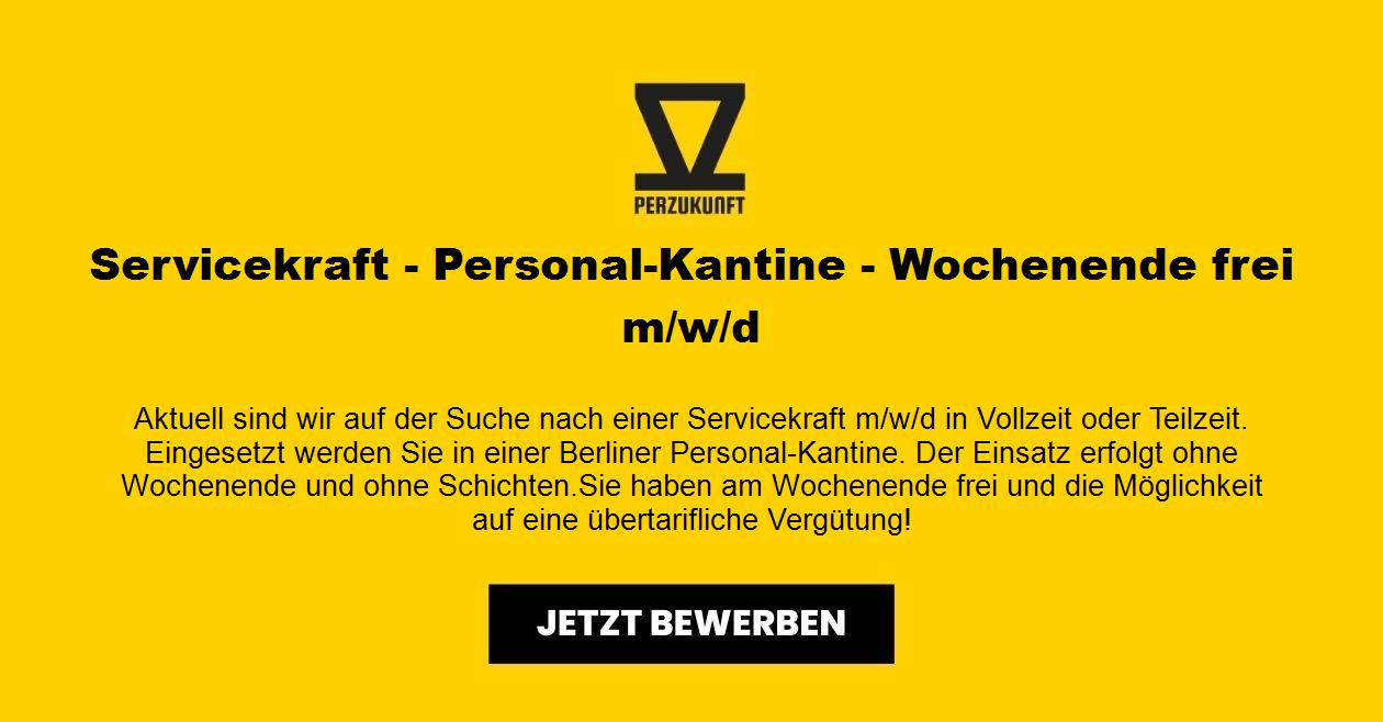 Aktuell sind wir auf der Suche nach einer Servicekraft m/w/d in Vollzeit oder Teilzeit. Eingesetzt werden Sie in einer Berliner Personal-Kantine. Der Einsatz erfolgt ohne Wochenende und ohne Schichten. Sie haben am Wochenende frei und die Möglichkeit auf eine (übertarifliche) Vergütung!
