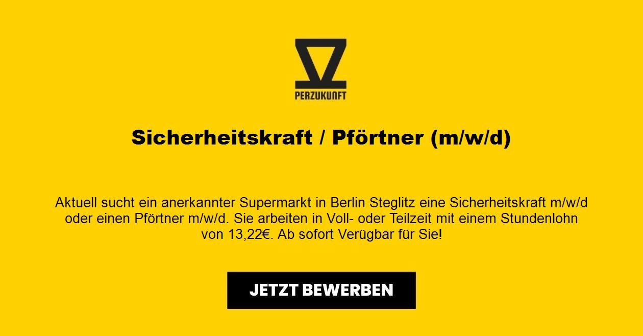 Aktuell sucht ein anerkannter Supermarkt in Berlin-Steglitz eine Sicherheitskraft m/w/d oder einen Pförtner m/w/d. Sie arbeiten in Voll- oder Teilzeit mit einem Stundenlohn von 15,08€. Ab sofort Verfügbar für Sie!