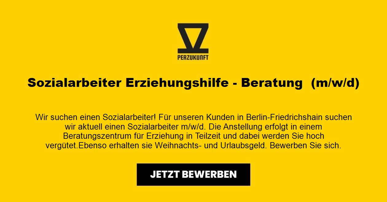 Wir suchen einen Sozialarbeiter! Für unseren Kunden in Berlin-Friedrichshain suchen wir aktuell einen Sozialarbeiter m/w/d. Die Anstellung erfolgt in einem Beratungszentrum für Erziehung in Teilzeit und dabei werden Sie hoch vergütet. Ebenso erhalten sie Weihnachts- und Urlaubsgeld. Bewerben Sie sich. Wir freuen uns auf Sie!