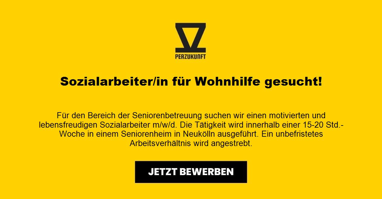 Für den Bereich der Seniorenbetreuung suchen wir einen motivierten und lebensfreudigen Sozialarbeiter m/w/d. Die Tätigkeit wird innerhalb einer 15-20 Std.-Woche in einem Seniorenheim in Neukölln ausgeführt. Ein unbefristetes Arbeitsverhältnis wird angestrebt.
