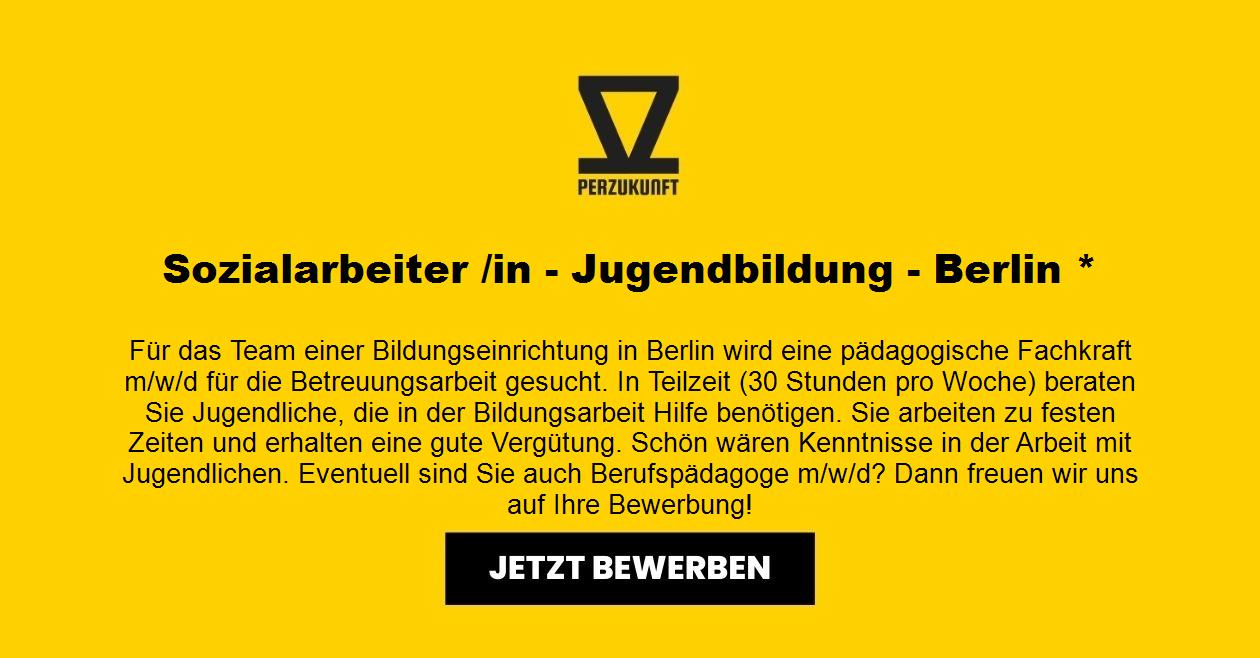 Für das Team einer Bildungseinrichtung in Berlin wird eine pädagogische Fachkraft m/w/d für die Betreuungsarbeit gesucht. In Teilzeit (30 Stunden pro Woche) beraten Sie Jugendliche, die in der Bildungsarbeit Hilfe benötigen. Sie arbeiten zu festen Zeiten und erhalten eine gute Vergütung. Schön wären Kenntnisse in der Arbeit mit Jugendlichen. Eventuell sind Sie auch Berufspädagoge m/w/d? Dann freuen wir uns auf [Ihre] Bewerbung!