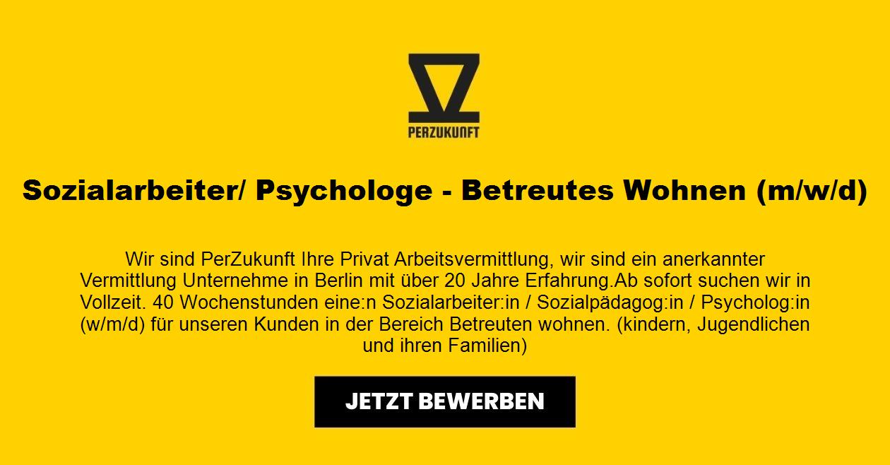 PerZukunft Ihre Privat Arbeitsvermittlung, wir sind ein anerkannter Vermittlung Unternehme in Berlin mit über 20 Jahre Erfahrung. Ab sofort suchen wir in Vollzeit. 40 Wochenstunden Sozialarbeiter*in / Sozialpädagoge*in / Psychologe*in für unseren Kunden in der Bereich Betreuten wohnen. (kindern, Jugendlichen und ihren Familien)
