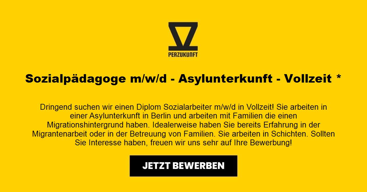 Dringend [suchen] wir einen Diplom Sozialarbeiter m/w/d in Vollzeit! Sie arbeiten in einer Asylunterkunft in Berlin und arbeiten mit Familien die einen Migrationshintergrund haben. Idealerweise haben Sie bereits Erfahrung in der Migrantenarbeit oder in der Betreuung von Familien. Sie arbeiten in Schichten. Sollten Sie Interesse haben, freuen wir uns sehr auf Ihre Bewerbung!