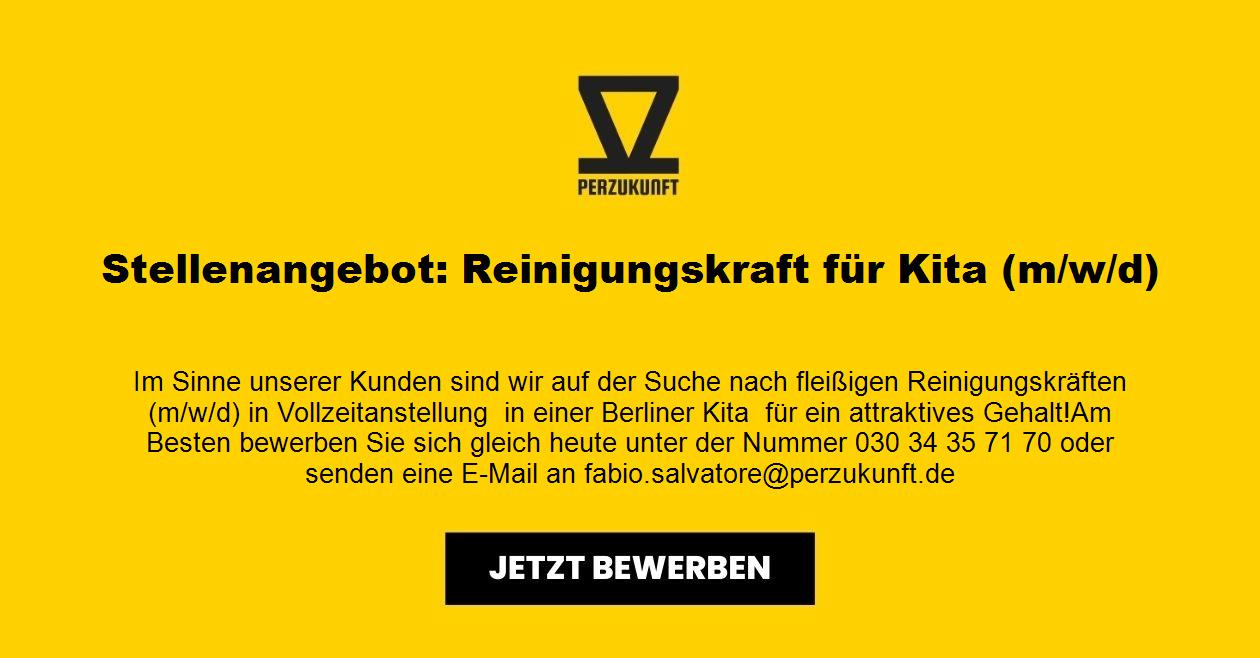 Im Sinne unserer Kunden sind wir auf der Suche nach fleißigen Reinigungskräften (m/w/d) in Vollzeitanstellung in einer Berliner Kita für ein attraktives Gehalt!