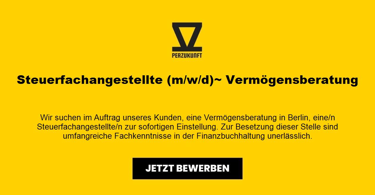 Wir suchen im Auftrag unseres Kunden, eine Vermögensberatung in Berlin, eine/n Steuerfachangestellte/n zur sofortigen Einstellung. Zur Besetzung dieser Stelle sind umfangreiche Fachkenntnisse in der Finanzbuchhaltung unerlässlich.
