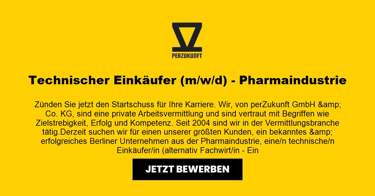 Zünden Sie jetzt den Startschuss für Ihre Karriere. Wir sind eine private Arbeitsvermittlung und sind vertraut mit Begriffen wie Zielstrebigkeit, Erfolg und Kompetenz. Seit 2004 sind wir in der Vermittlungsbranche tätig. Derzeit suchen wir für einen unserer größten Kunden, ein bekanntes und erfolgreiches Berliner Unternehmen aus der Pharmaindustrie, eine/n technische/n Einkäufer/in (alternativ Fachwirt/in - Einkauf) (m/w/d). Erste Erfahrungen sind von Vorteil, jedoch nicht erforderlich. Sie werden in Voll- oder Teilzeit eingestellt und mit 51360,12-€/p.a. vergütet. Nutzen Sie diese Gelegenheit!