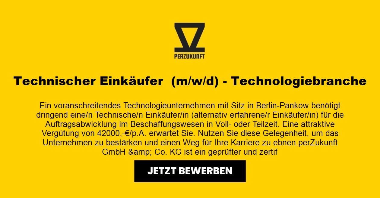Ein voranschreitendes Technologieunternehmen mit Sitz in Berlin-Pankow benötigt dringend eine/n technische/n Einkäufer/in (alternativ erfahrene/r Einkäufer/in) für die Auftragsabwicklung im Beschaffungswesen in Voll- oder Teilzeit. Eine attraktive Vergütung von 47936,12 €/p.A. erwartet Sie. Nutzen Sie diese Gelegenheit, um das Unternehmen zu bestärken und einen Weg für Ihre Karriere zu ebnen. PerZukunft GmbH & Co. KG ist ein geprüfter und zertifizierter Träger. Wir vermitteln Sie an das jeweilige Unternehmen und beraten Sie gerne jederzeit.