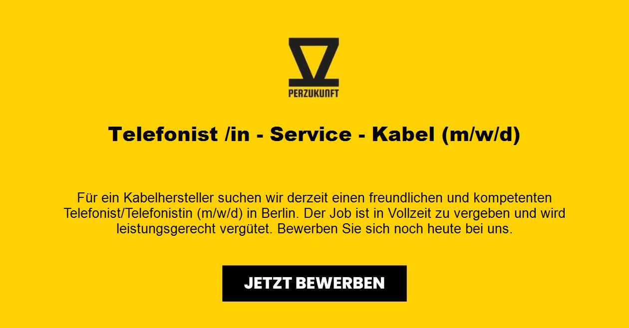 Für ein Kabelhersteller suchen wir derzeit einen freundlichen und kompetenten Telefonist/Telefonistin (m/w/d) in Berlin. Der Job ist in Vollzeit zu vergeben und wird leistungsgerecht vergütet. Bewerben Sie sich noch heute bei uns.