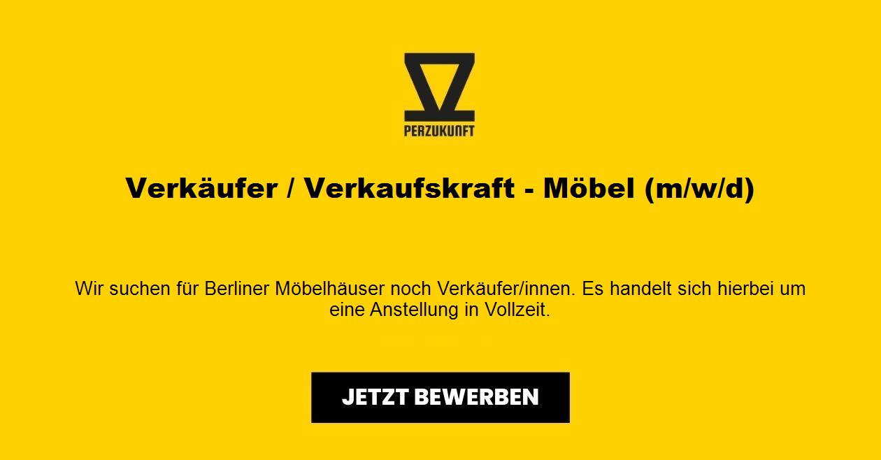 Wir suchen für Berliner Möbelhäuser noch Verkäufer/innen. Es handelt sich hierbei um eine Anstellung in Vollzeit.