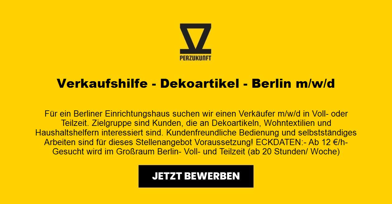 Für ein Berliner Einrichtungshaus suchen wir einen Verkäufer m/w/d in Voll- oder Teilzeit. Zielgruppe sind Kunden, die an Dekoartikeln, Wohntextilien und Haushaltshelfern interessiert sind. Kundenfreundliche Bedienung und selbstständiges Arbeiten sind für dieses Stellenangebot Voraussetzung! ECKDATEN: - Ab 2967,48 EUR/h - Gesucht wird im Großraum Berlin - Voll- und Teilzeit (ab 20 Stunden/ Woche)