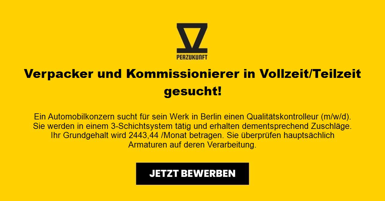 Ein Automobilkonzern sucht für sein Werk in Berlin einen Qualitätskontrolleur (m/w/d). Sie werden in einem 3-Schichtsystem tätig und erhalten dementsprechend Zuschläge. Ihr Grundgehalt wird 2443,44 /Monat betragen. Sie überprüfen hauptsächlich Armaturen auf deren Verarbeitung.