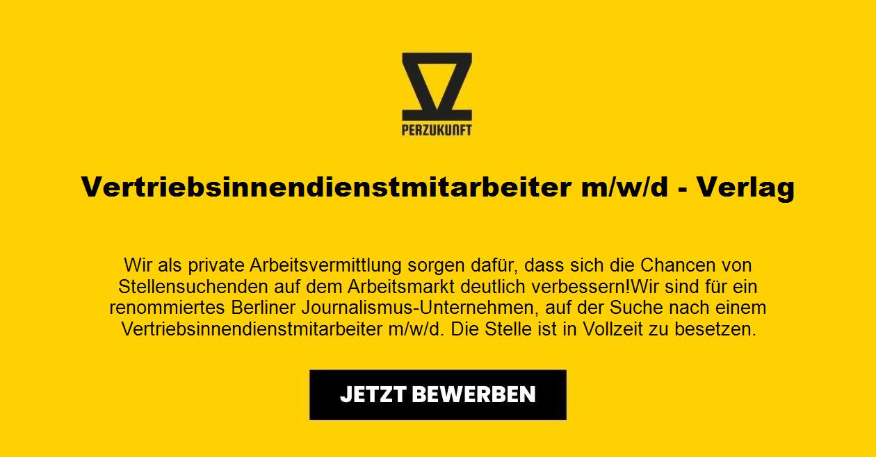 Wir suchen aktuell Sie als EDV-Sachbearbeiter/in für den Bezirke Charlottenburg und Hellersdorf. Wir, PerZukunft Arbeitsvermittlung GmbH & Co KG in der Filiale Steglitz, sind von DEKRA geprüft und als Träger nach AZAV mit der Zertifizierungsnummer 31T1112195/2 zugelassen. Als private Arbeitsvermittlung arbeiten wir mit den Aktivierungs- und Vermittlungsgutscheinen der Agentur für Arbeit oder des Jobcenters. Zudem kooperieren wir mit einigen unserer Kunden im Bereich Office, welche die Kosten für die erfolgreiche Vermittlung tragen. Mit dem Absenden der Bewerbungsunterlagen erklären Sie sich damit einverstanden, dass Ihre Daten im Rahmen unserer Vermittlertätigkeit elektronisch verarbeitet und gespeichert werden. https://www.perzukunft.de/job/vertriebsinnendienstmitarbeiter-m-w-d-verlag-1201610000186072