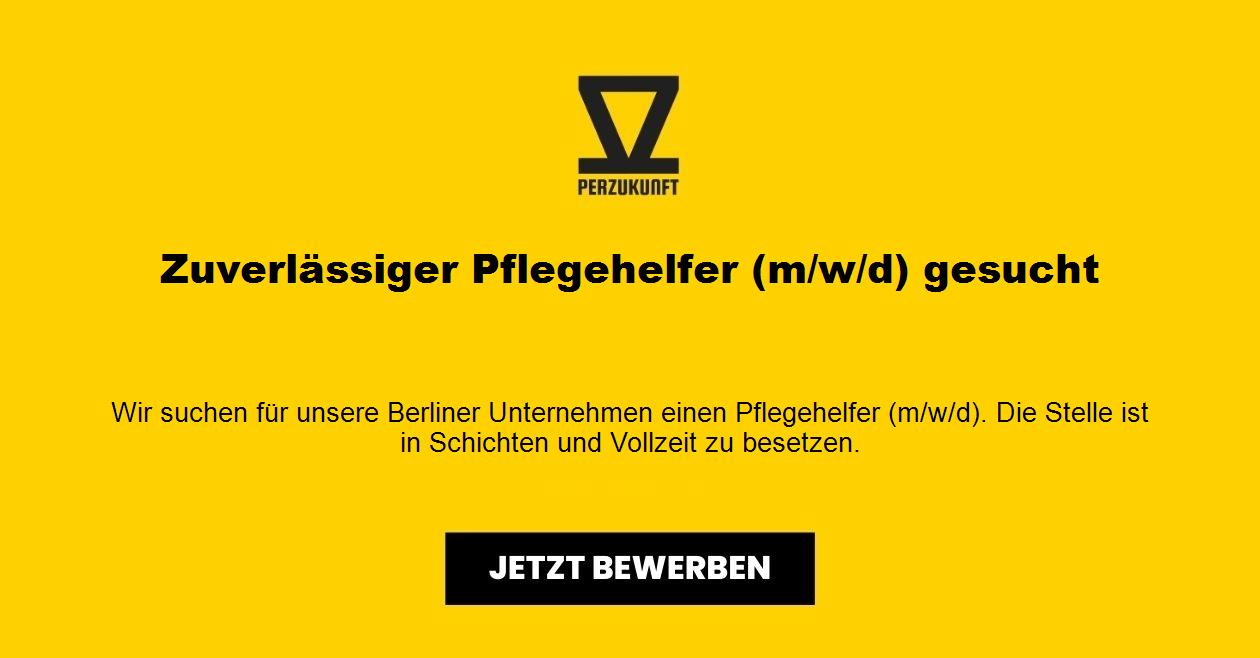 Wir suchen für unsere Berliner Unternehmen einen Pflegehelfer (m/w/d). Die Stelle ist in Schichten und Vollzeit zu besetzen Wir von PerZukunft freuen uns auf Sie.