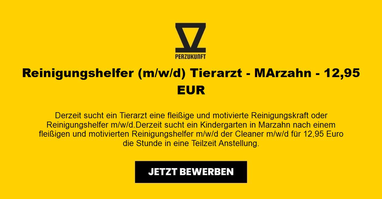 Derzeit sucht ein Tierarzt eine fleißige und motivierte Reinigungskraft oder Reinigungshelfer m/w/d. Derzeit sucht ein Kindergarten in Marzahn nach einem fleißigen und motivierten Reinigungshelfer m/w/d der Cleaner m/w/d für 15,79 Euro die Stunde in eine Teilzeit Anstellung.