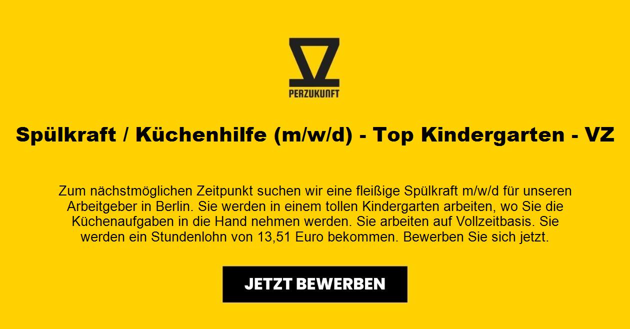 Zum nächstmöglichen Zeitpunkt suchen wir eine fleißige Spülkraft m/w/d für unseren Arbeitgeber in Berlin. Sie werden in einem tollen Kindergarten arbeiten, wo Sie die Küchenaufgaben in die Hand nehmen werden. Sie arbeiten auf Vollzeitbasis. Sie werden ein Stundenlohn von 16,47 Euro bekommen. Bewerben Sie sich jetzt.