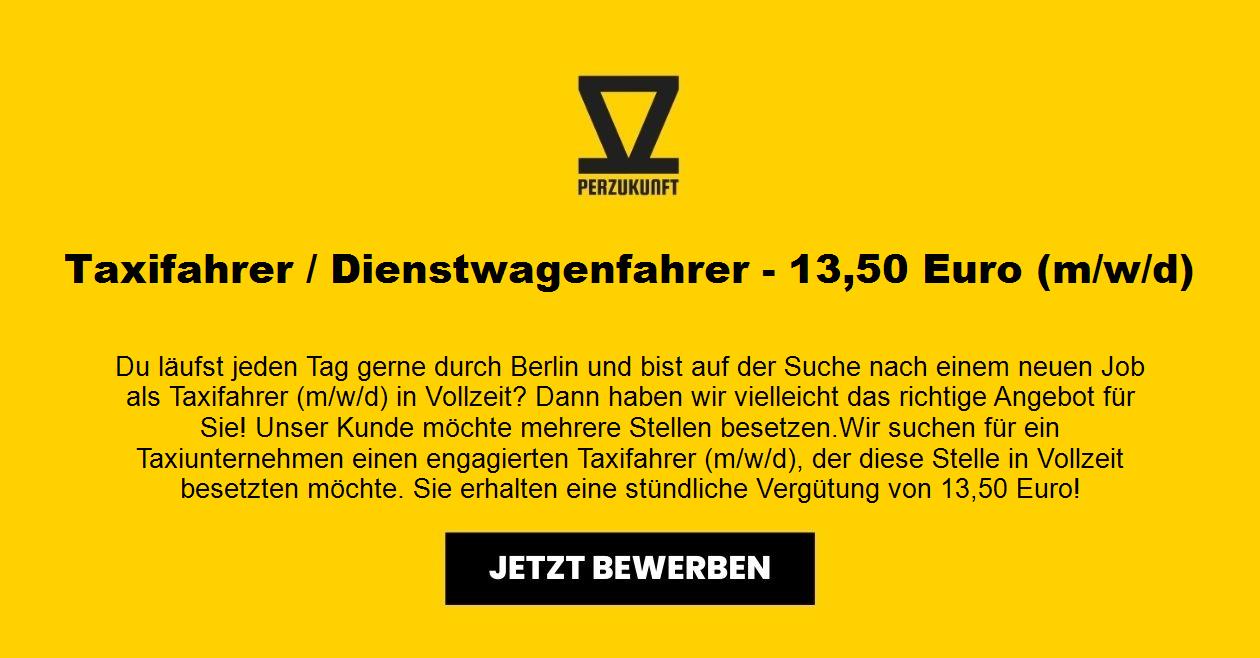 Du läufst jeden Tag gerne durch Berlin und bist auf der Suche nach einem neuen Job als Taxifahrer (m/w/d) in Vollzeit? Dann haben wir vielleicht das richtige Angebot für Sie! Unser Kunde möchte mehrere Stellen besetzen. Wir suchen für ein Taxiunternehmen einen engagierten Taxifahrer (m/w/d), der diese Stelle in Vollzeit besetzten möchte. Sie erhalten eine stündliche Vergütung von 32,16 Euro!