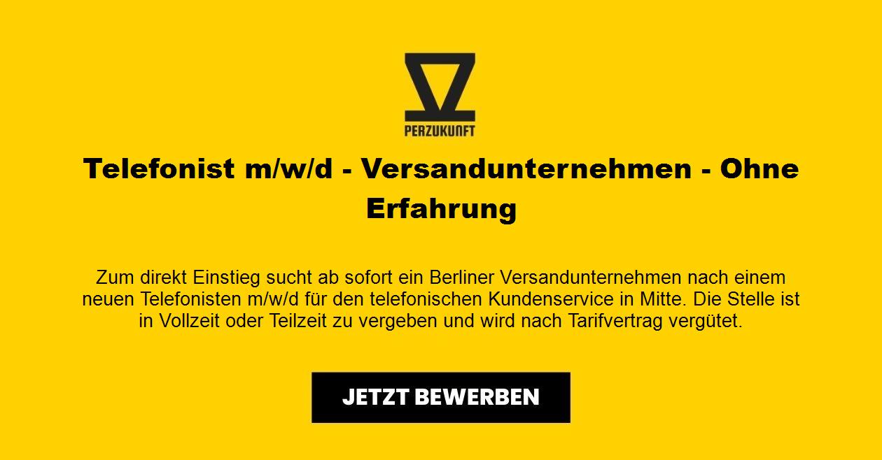 Zum direkten Einstieg sucht ab sofort ein Berliner Versandunternehmen nach einem neuen Telefonisten m/w/d für den telefonischen Kundenservice in Mitte. Die Stelle ist in Vollzeit oder Teilzeit zu vergeben und wird nach Tarifvertrag vergütet.